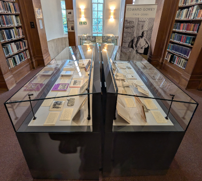 I managed to visit Oxford on the 6th of November and attended the New College Library exhibit. It is a modest exhibit and consists of four cases which display items from the library's David Mann (1935-2012) collection. Each case addresses a different subject: Gorey's Life, Primary Works, Gorey & Animals and Children's Books.The majority of the books on display are not first editions and there is nothing particularly special on display but if you are in the area, it's definitely worth a visit - if not only to reaffirm that Gorey exhibits is something the UK want more of!