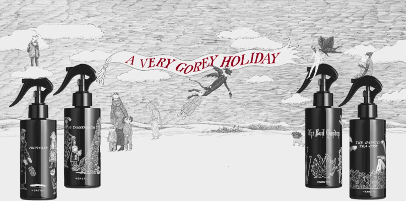 Heretic Parfum has done a quite incredible collaboration with Gorey, transforming their whole site with moving Gorey art, character actors and story lines to promote a launch of four festive room sprays: A Very Gorey Holiday: Room Sprays.