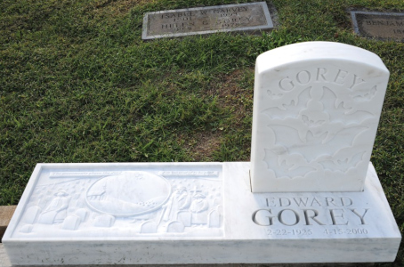 And lastly, a very unexpected bit of news is that Gorey now has a headstone! Located in the Woodlands Cemetery in Ironton, Ohio where his mother, Helen Gorey, and aunt, Isabel Garvey, are buried and where a portion of Edward Gorey's ashes were interred.